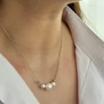 این گردنبند با ترکیب بینقص مرواریدهای سفید و گویهای فلزی، ظاهری ایجاد میکند که: